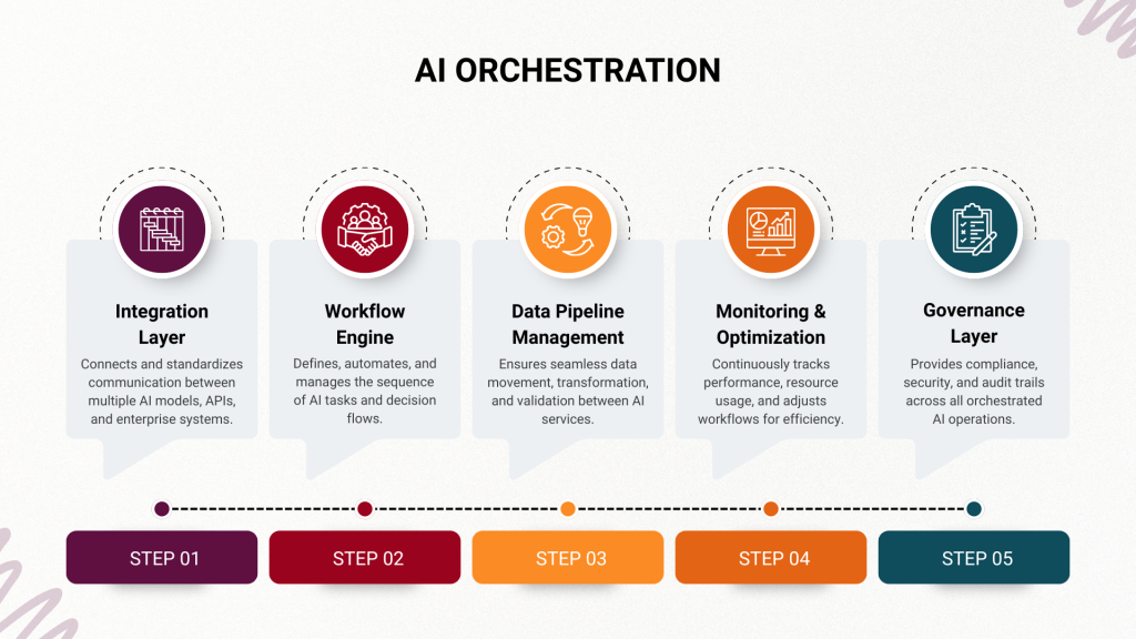 5. Governance Layer – Provides compliance, audit trails, and security across orchestrated systems.